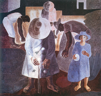 No afresco Algodão (Figura 4), temos uma mulher e uma criança afrodescendentes em primeiro plano, colhendo o chumaço de algodão e, ao fundo, há três homens de mesma etnia, curvados, trabalhando para ensacar o produto. Da mulher também curvada não se vê o rosto, porém a criança olha o observador de frente com seu vestido azul e algodão nas mãos. Nota-se a desproporção dos pés e das mãos das pessoas adultas e uma leve desproporção nos membros inferiores da criança que, por sua vez, não tem alteração de tamanho das suas mãos. Nessa imagem se nota a repetição de pessoas pretas no trabalho em lavoura, representação que Portinari já fazia desde o início dos anos 1920. Esse contexto de trabalho fora conhecido pelo pintor na infância, pois trabalhara na lavoura junto aos pais, imigrantes italianos e colonos em Brodowski. Lembrando que em uma sociedade como o Brasil dos anos 1930 e 1940 havia uma valorização da ideologia do trabalho duro, da labuta como algo que forma o caráter e os cidadãos, além de não haver o combate ao trabalho infantil. Em vários sistemas políticos nesse mesmo período no mundo, como no realismo soviético e na estética nazista, havia uma valorização dessa ideologia e a criminalização de atitudes rotuladas como vagabundagem ou malandragem. Por isso, não havia uma valorização, por exemplo, de rodas de samba dentro da edificação do MES. É importante recordar que as religiões de matrizes africanas também eram bastante perseguidas. Assim, entende-se que durante a Era Vargas há uma repetição desses valores afeitos ao trabalho, contra a vadiagem, boemia e religiosidade afro-brasileira.
