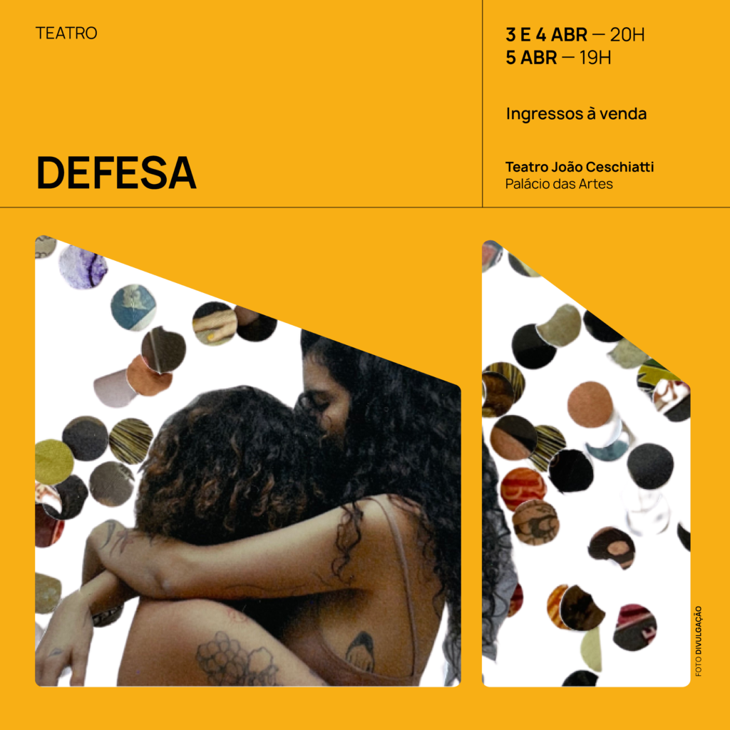 “Defesa” é um espetáculo teatral dirigido por Igui Leal que articula teatro, audiovisual, dança, poesia e performance para abordar o cotidiano não óbvio de uma relação sapatão. Em cena, Júlia Campos e Kami Soares conduzem uma dramaturgia fragmentada que transita entre ficção e memória, convidando o público a participar de uma festa de casamento que lentamente se transforma em um percurso pelas lembranças do casal. Criado por mais de quinze artistas LGBTQIAPN+, o espetáculo tensiona a invisibilização histórica das existências sapatão e aposta no amor como gesto político de presença e imaginação de futuro.