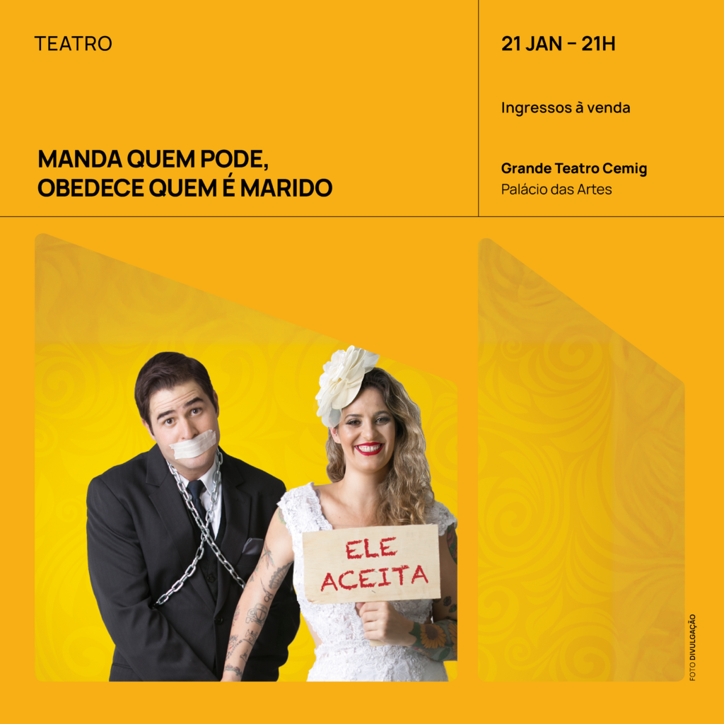 Sinopse – Espetáculo estreante de maior público na Campanha de Popularização de Teatro de Belo Horizonte, em 2017. Foram mais de 50 mil espectadores em 30 cidades de Minas Gerais, além de temporada em São Paulo. “Jorge e Vanessa foram flechados pelo cupido. No início da relação, tudo parecia fazer sentido. Entre quatro paredes, nada era proibido. Mas, com o passar do tempo, Jorge tem aprendido, e vai ensinar a você, que, nesta grande comédia, manda quem pode, obedece quem é marido!”