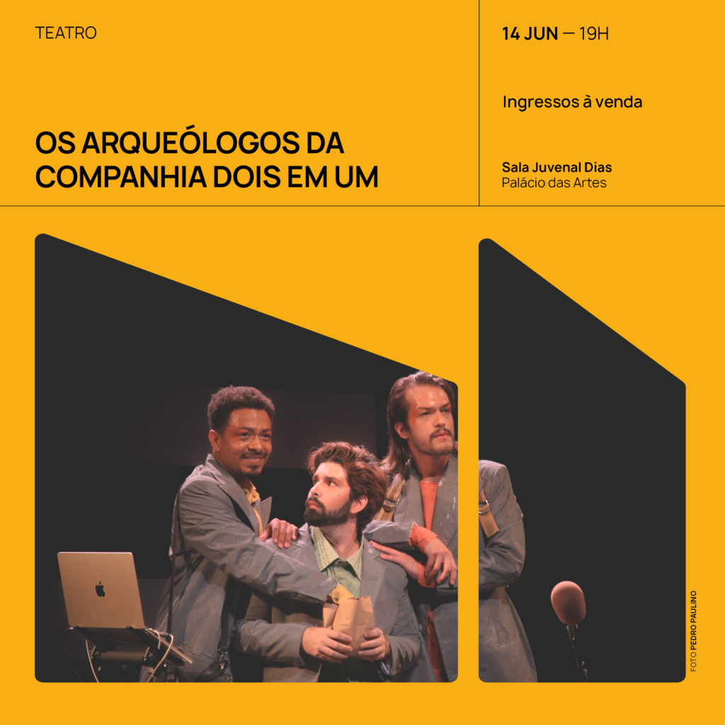 Em dado momento da peça Os Arqueólogos, um pai explica ao filho que “toda vez que você tira uma fotografia, você para um pedacinho do tempo”. O teatro é justamente esse tempo que não se congela: a arte dos momentos efêmeros vividos e compartilhados entre o palco e a plateia. Pensando na volatilidade do tempo e na beleza dos momentos sutis de afeto e intimidade, a Cia Dois em Um mergulhou no texto de Vinícius Calderoni para a criação de seu terceiro espetáculo, que estreou no dia 30 de julho de 2025, no Galpão 3 da Funarte-MG, em Belo Horizonte. Os Arqueólogos é um espetáculo que parte do encontro entre memória, tempo e afeto, construindo uma cena sensível e provocadora a partir da escuta, do corpo e da palavra. O trabalho acaba de ser indicado ao 36º Prêmio Shell de Teatro, na categoria Destaque Nacional, uma das premiações mais relevantes do cenário teatral brasileiro. Fundada em 2020 pelos artistas da cena Dê Jota Torres e Lucas Prado, a Dois em Um vem se notabilizando por uma pesquisa continuada, pautada no trabalho do ator e na dramaturgia contemporânea. Essas foram as bases de seus dois primeiros espetáculos: Teatro Decomposto (com texto do romeno Matéi Vișniec, estreado em 2023) e o espetáculo voltado para as juventudes A Língua do Fogo (com texto da mineira Malu Grossi Maia, estreado em 2024). Com Os Arqueólogos, o coletivo realiza a primeira montagem profissional de um texto de Vinícius Calderoni em Minas Gerais. Conhecido por seu trabalho como músico — em carreira solo e integrando a banda 5 a Seco —, além de ator, diretor e dramaturgo, Calderoni assina textos premiados como o musical Elza (2018), dirigido por Duda Maia; Sísifo (2020), solo de Gregório Duvivier dirigido pelo próprio autor; Museu Nacional, Todas as Vozes do Fogo (2022), espetáculo da Cia. Barca dos Corações Partidos; e o recente Nossa História com Chico Buarque (2025), dirigido por Rafael Gomes. Contudo, o dramaturgo — celebrado por sua capacidade de conciliar uma escrita sofisticada com ampla comunicação com o público — ainda não havia sido abordado por artistas da cena mineira. Ao retomar o texto de Os Arqueólogos, escrito em 2015 e que rendeu a Calderoni o Prêmio APCA de Melhor Dramaturgia, a Cia Dois em Um realiza um movimento incomum dentro do teatro mineiro. “Nós vínhamos observando que os artistas da nossa geração, em geral, optavam por dramaturgias próprias ou por textos clássicos. Mas por que não trazer novamente à cena a obra de um autor vivo, contemporâneo e extraordinário, escrita há menos de uma década?”, explica Dê Jota. De fato, Os Arqueólogos já teve uma primeira montagem, realizada em São Paulo, com direção de Rafael Gomes e com o próprio Vinícius Calderoni no elenco. Ao dar uma nova vida ao texto, passado relativamente pouco tempo desde sua estreia — mas um período marcado por turbulências políticas, econômicas e sociais, além de uma pandemia que suspendeu nosso tempo e nosso convívio —, a Dois em Um propõe uma verdadeira arqueologia de um tempo e de uma produção que parecem cada vez mais voláteis. “É, de certa forma, uma celebração do nosso próprio fazer. Querer encenar esse texto neste momento, com estes outros atores, é celebrar o texto do Vinícius, celebrar a memória e celebrar as muitas vidas que o teatro nos permite viver e reviver”, comenta Lucas Prado, que divide a cena da montagem com Dê Jota e com o músico João Pedro Vasconcelos, diretor musical do espetáculo. Somando-se à equipe criativa, Os Arqueólogos conta com direção de Rogério Lopes, artista e pesquisador. O diretor já marcou a trajetória da Cia Dois em Um quando, em 2017, assinou a direção dos espetáculos de formatura de Prado e Dê Jota, respectivamente A Cerimônia (de Fernando Arrabal) e Os Negros (de Jean Genet). Se, em 2018, à época da formatura no Teatro Universitário da UFMG (TU), Rogério era o elo de conexão entre duas montagens distintas, agora o diretor se encontra em um lugar de pleno compartilhamento da sala de ensaio e do processo de criação do espetáculo. A cenografia e os figurinos são assinados por Tereza Bruzzi, Paulo Mendes e Matheus Lukashevich.