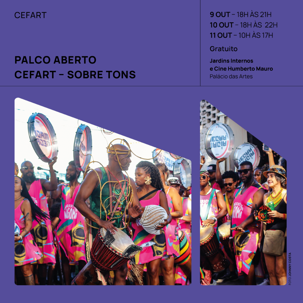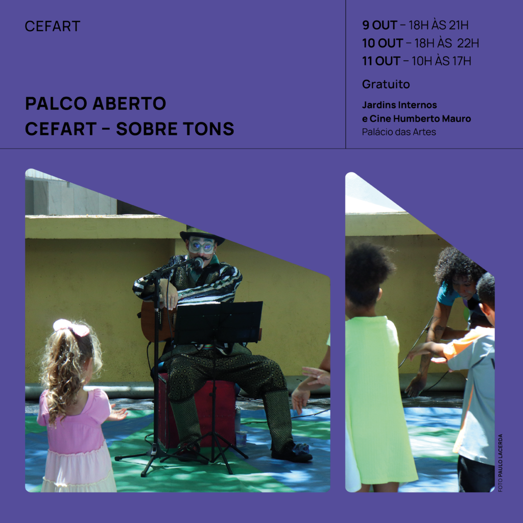 O Centro de Formação Artística e Tecnológica (CEFART) da Fundação Clóvis Salgado (FCS) apresenta mais uma edição do projeto “Palco Aberto”, realizada por meio do “Sobre Tons”, programa antirracista do Ministério Público de Minas Gerais (MPMG). Com música, apresentações teatrais, dança, oficinas, contação de histórias e outras expressões artísticas, a iniciativa traz ao Palácio das Artes uma programação que reforça a importância das artes negras e celebra a infância durante a Semana da Criança. Tendo isso em mente, as atividades se dividem entre os dias 9 de outubro, das 18h às 21h; 10 de outubro, das 18h às 22h, integrando o “Palco Aberto Cefart – Sobre Tons”; e 11 de outubro, das 10 às 17h, com o “Palco Aberto Cefart – Sobre Tons – Dia do Pequeno Artista”. Todas as atividades são gratuitas.