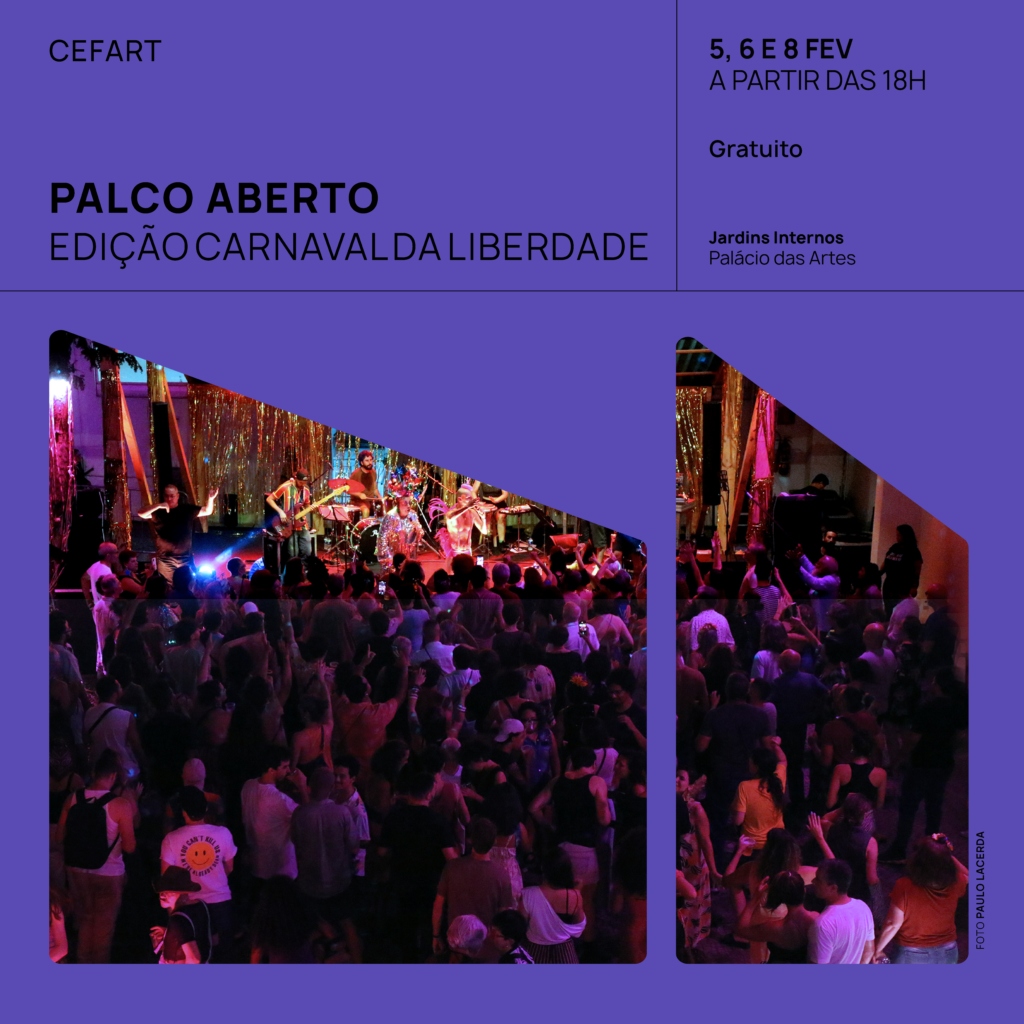 A programação de pré-Carnaval tem início com o projeto Palco Aberto – Nova Geração do Samba em BH, a ser realizado nos jardins do Palácio das Artes, com shows das 19h às 21h, nos dias 05, 06 e 08/02. Sobem ao palco Cinara Gomes, Aline Reis, Aline Calixto e Gisele Couto, além dos grupos Nossa Roda e Mulheres no Choro. A programação inclui ainda discotecagens dos DJs Balzzac, Fê Lins e Vini Brown.