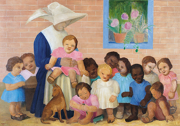 Dois anos depois outra obra de Tarsila do Amaral, menos divulgada que 2ª Classe, retorna ao tema da infância. Na obra Crianças a pintora representa um orfanato e também uma pequena aglomeração com doze crianças. Os coloridos das roupas, da parede e das flores da janela compondo o cenário chamam muita atenção. Existem crianças calçadas e descalças. Vemos um brinquedo entre as duas meninas em primeiro plano. As crianças e o cachorro em torno da freira passam uma sensação de harmonia, acentuada pela menina em primeiro plano com uma flor nas mãos e um semblante de felicidade e tranquilidade. Na representação de crianças nesta obra, observam-se traços, gestos e feições mais aproximadas de uma possível harmonia. Também se percebe esse equilíbrio em um elemento que chama atenção na cena: uma freira facilmente identificável pelo seu véu em forma de cornette e um rosto de feição calma.
